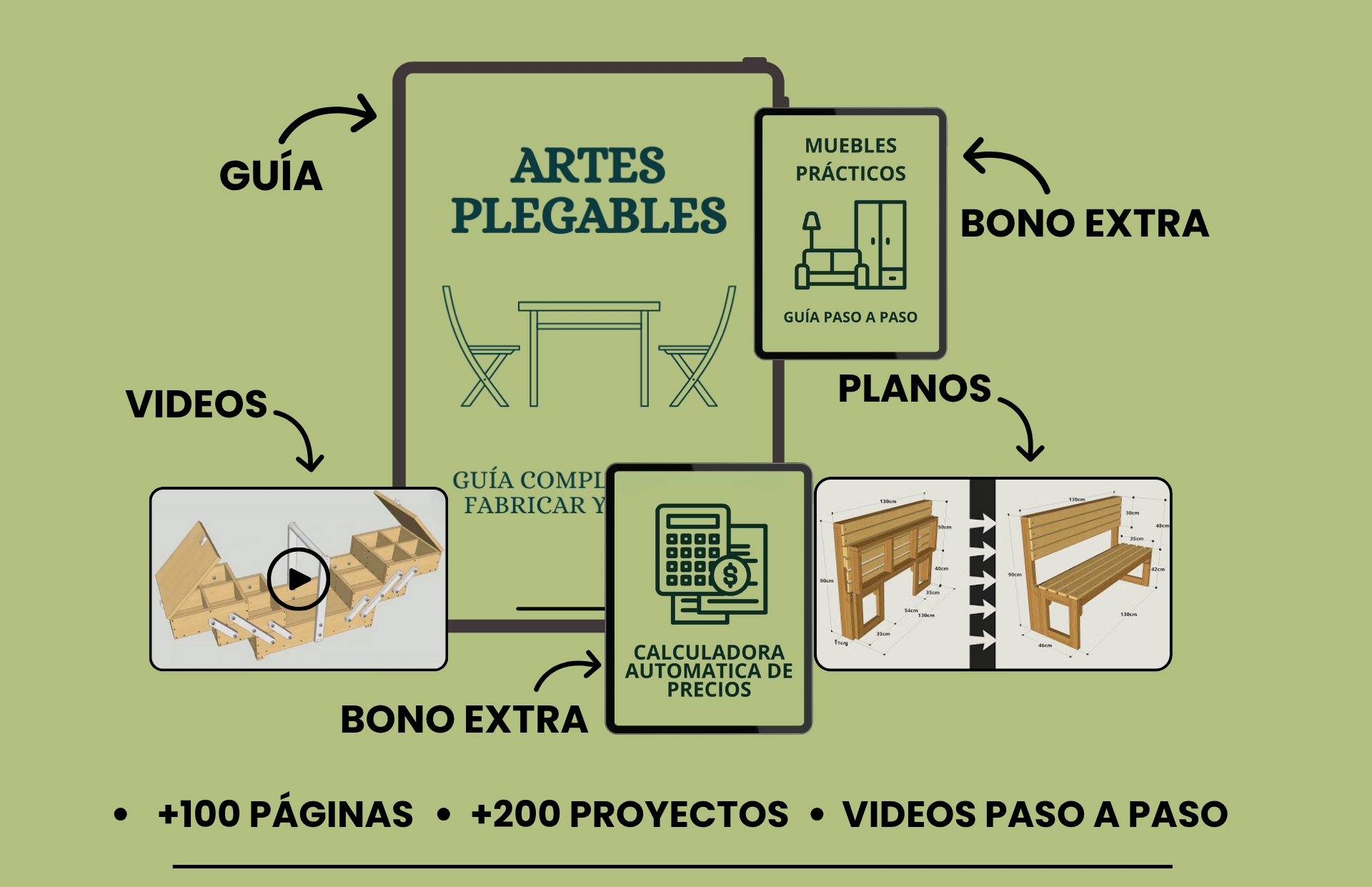 Más de 200 modelos: mesas, sillas, escritorios, camas Murphy, estantes, bancadas y mucho más, todos con planos, medidas y lista de materiales.
